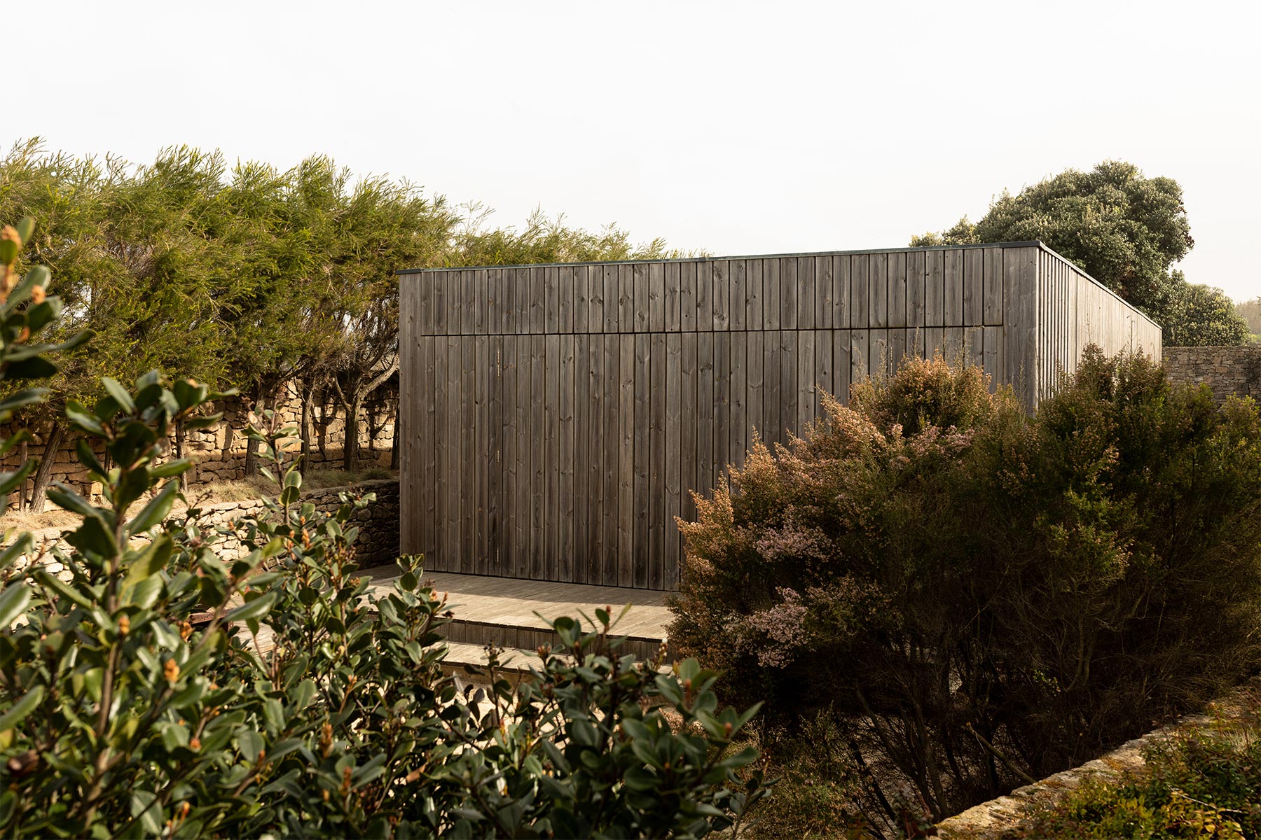 A true beach cabin that seeks to blend in with its surroundings and protect itself from the natural elements, bringing the nature of the elements into its interior, creating a cozy atmosphere in the wood that gives it shape, in the stone walls that protect it from the winds and the plant life that surrounds it.